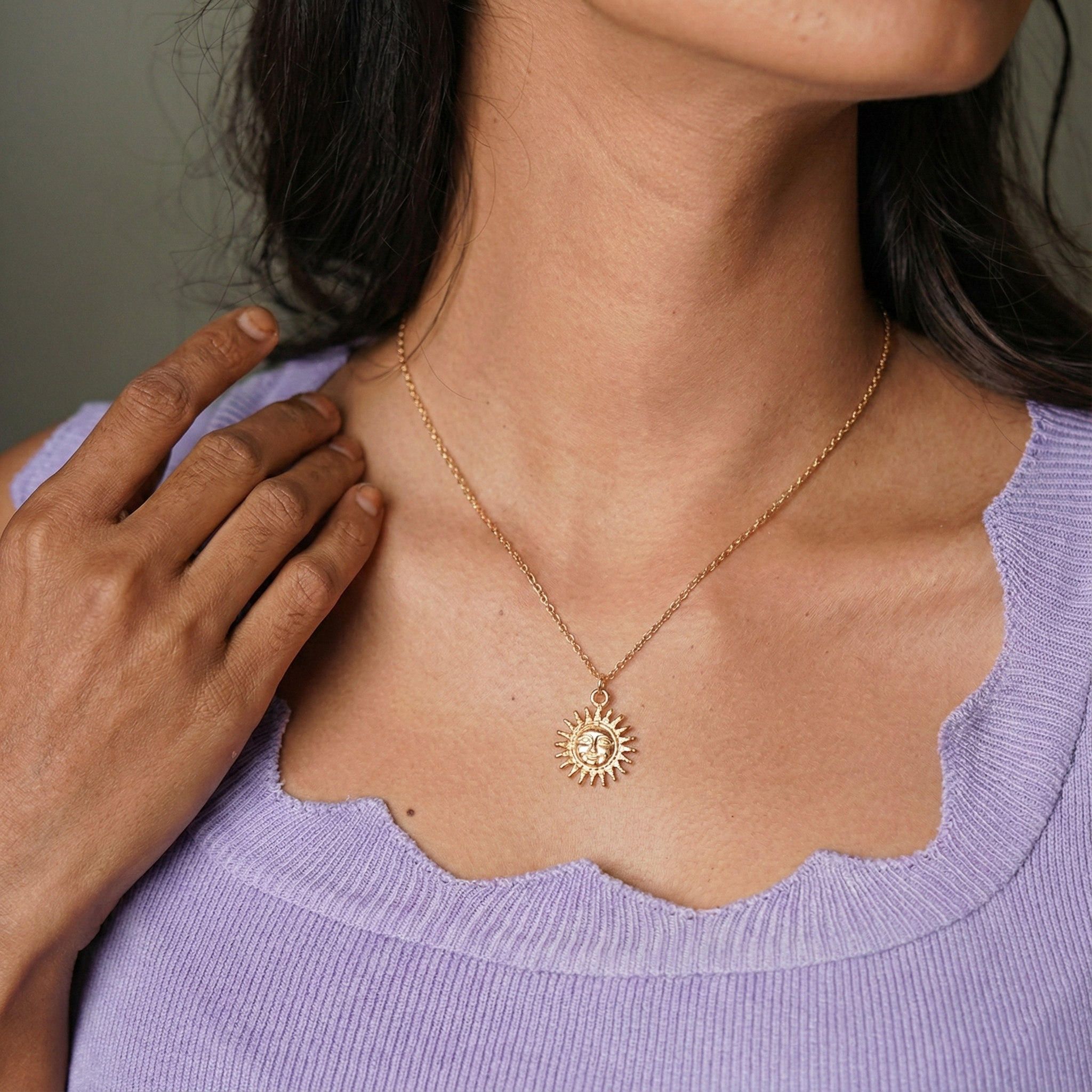 Brighten up your everyday style with this dainty sun pendant necklace. Finished in a beautiful gold tone, the radiant sun charm symbolizes warmth, positivity, and new...