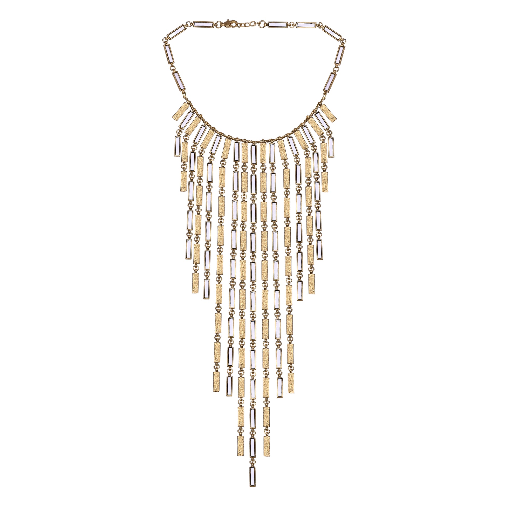 This over-the-top waterfall statement necklace makes every moment a red-carpet one. Designed with cascading gold-toned bars and delicate chain detailing, this necklace creates a dramatic fringe silhouette that beautifully lengthens the neck.