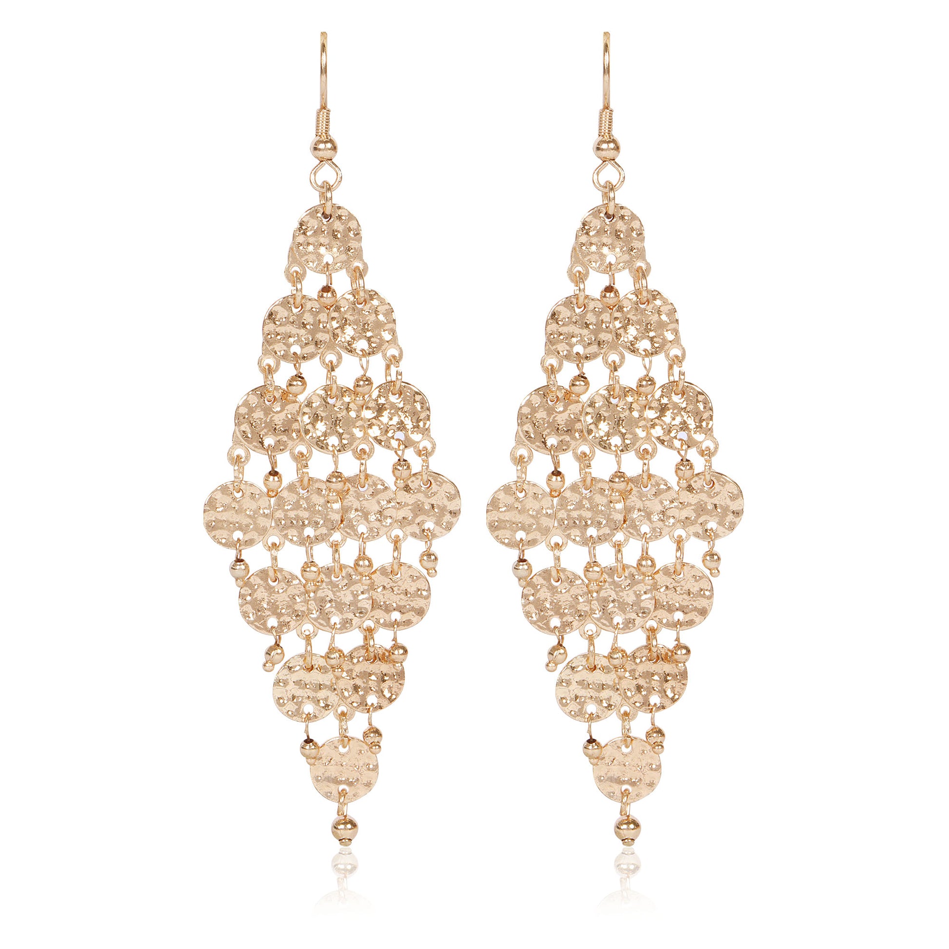 Layered Coin Dangle Earrings add instant poise to festive and party wear. Boasting a stunning cascade design featuring textured golden discs, these earrings catch the light really well and create an eye-catching movement whenever one walks.