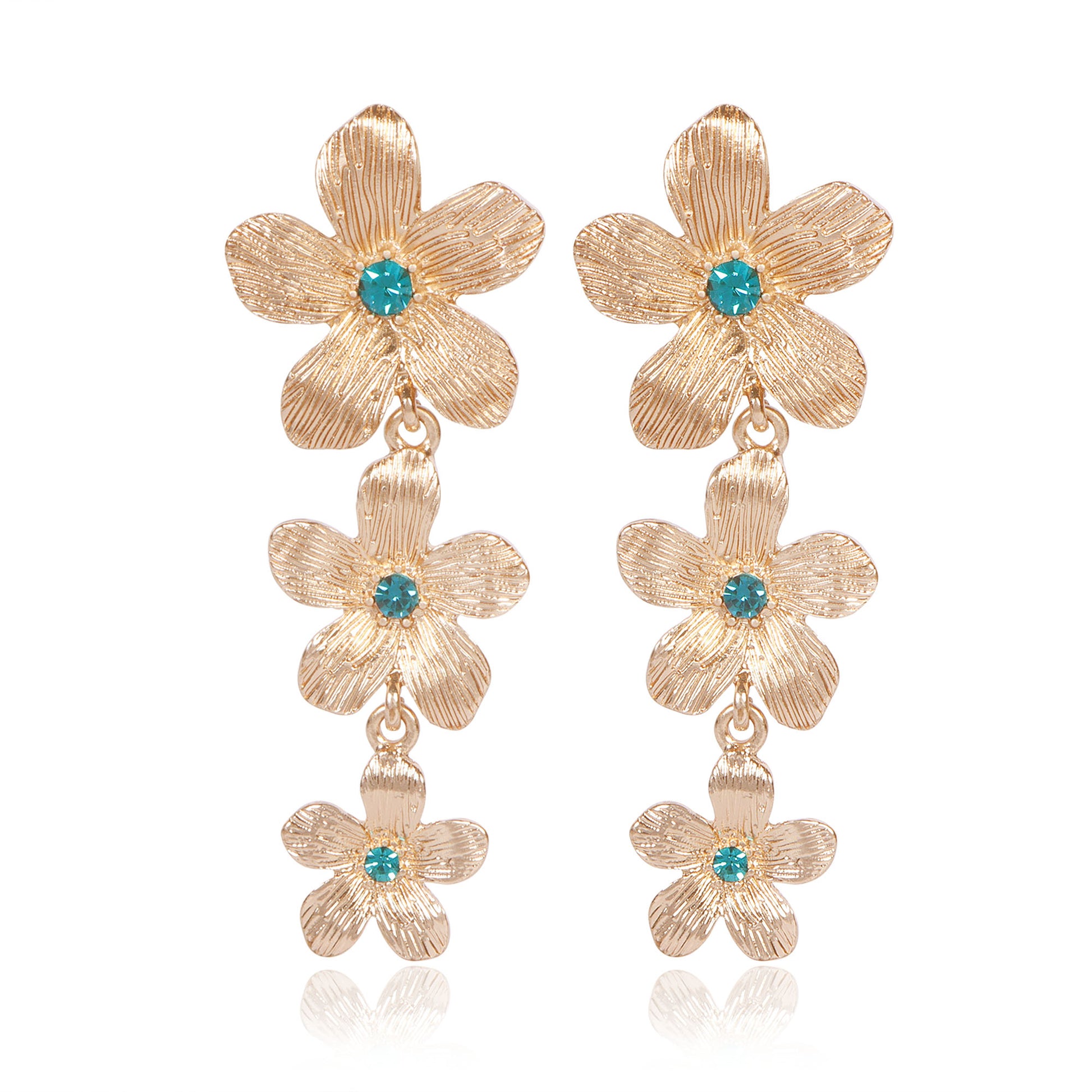Effortless glamour to your look with these gold-toned floral dangler earrings, delicately crafted with cascading flowers and sparkling aqua stones at the center. The three-tier flower design adds a charming flow, making it apt for festive wear, brunches, and evening outings.