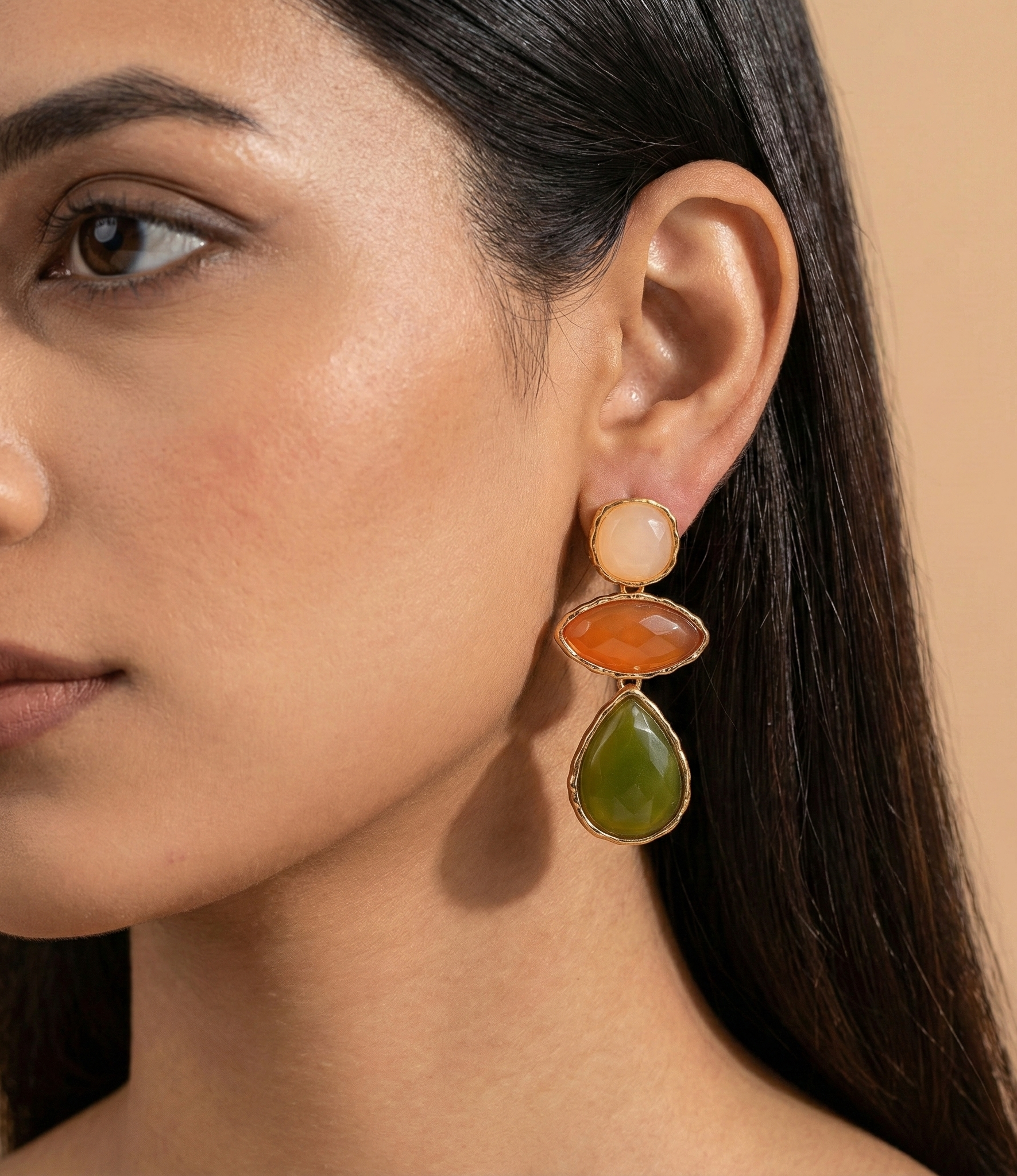 Sophistication to your fashion with our Boho Gem Drop Earrings. These earrings are designed with a beautiful fusion of beige, terracotta, and olive shades set with a golden finish. The earrings are very light and perfect for special and evening parties.