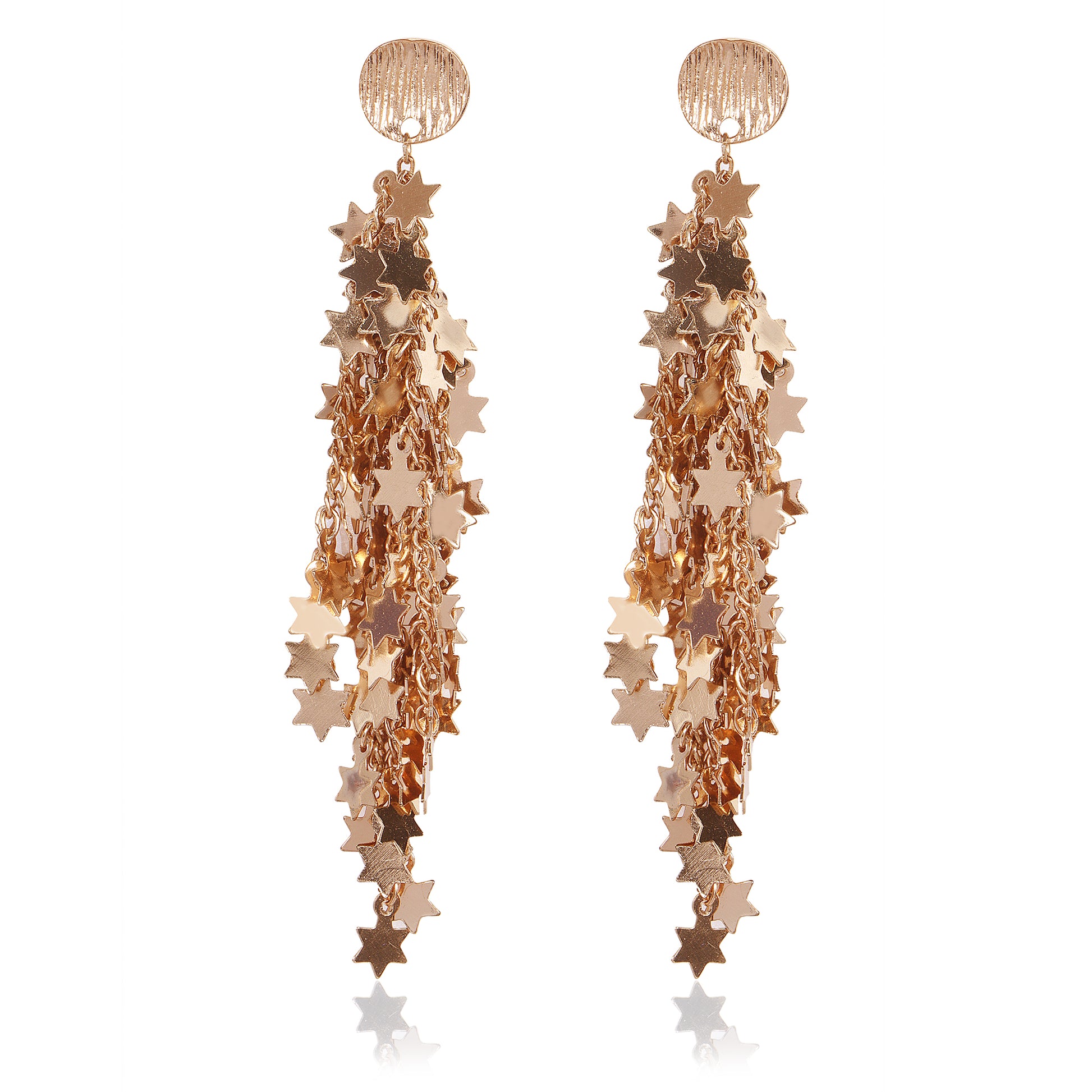 Glamour to your outfit with Starlit Cascade Gold Drop Earrings. The earrings have several charms shaped like stars that are strung on strings, giving it a waterfall effect with every movement.